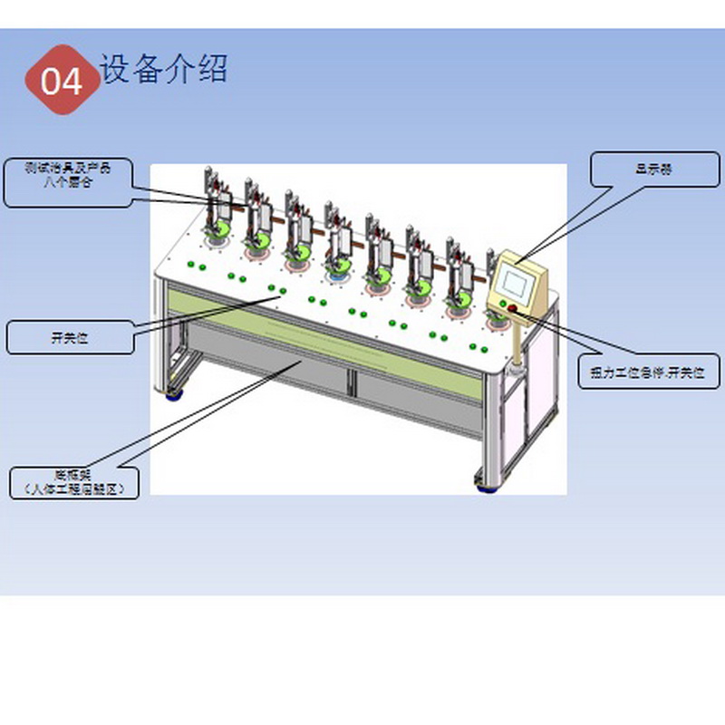 转轴铰链在设备上使用频繁,且生产工艺较为难以控制。铆合强度过大或者过小都会影响产品的品质。所以一般厂家在生产时,对产品进行100%的磨合测试。同时也加大产品的寿命测试数量。当然研发时对产品的扭力衰减进行测试也是不可少的一个测试项目。加大抽检数量,为增加测试效率,所以就需要多工位的磨合试验机。当然也需要考虑实验室的空间。市场上一般有三工位,五工位,八工位等磨合跑合试验机。针对市场要求,推出一款八工位转轴磨合试验机。